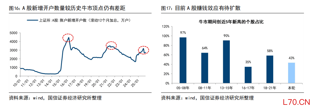 目前A股市场情绪尚未明显过热,新增开户数量和市场赚钱效应还未创新高。股价大涨的数量,也与过去多轮牛市期间仍有距离。
