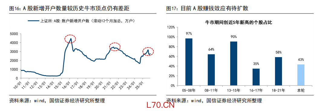 目前A股市场情绪尚未明显过热,新增开户数量和市场赚钱效应还未创新高。股价大涨的数量,也与过去多轮牛市期间仍有距离。