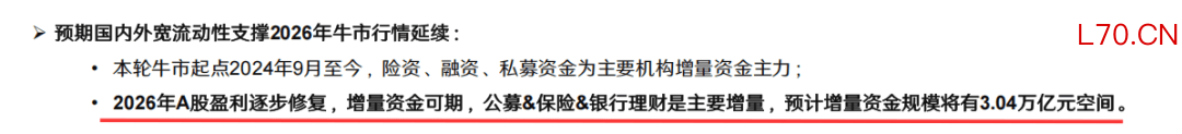 据券商研报预计,随着2026年A股盈利逐步修复,增量资金可期,公募、保险、银行理财是主要增量,预计增量资金规模将有超过3万亿元空间。