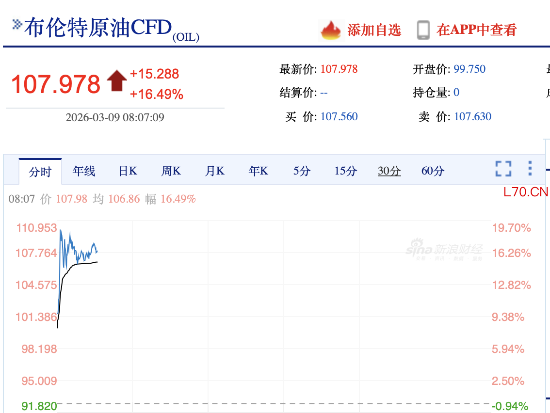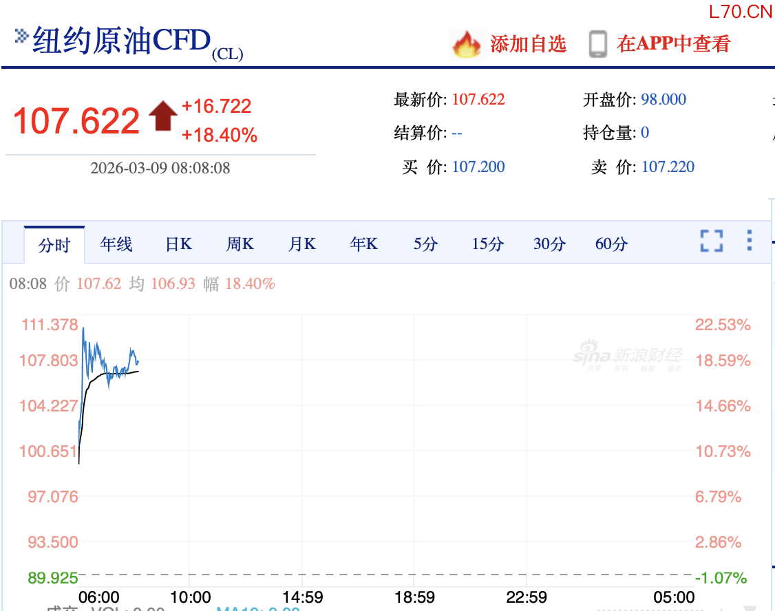 截至界面新闻发稿前,美国原油涨幅为18.40%,报每桶107.622美元;布伦特原油价格涨幅为16.49%,报每桶107.978美元。