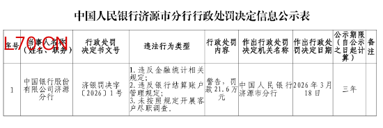 中国银行济源分行被罚21.6万元:违反金融统计相关规定等