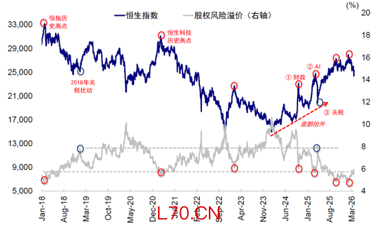 2)中国市场:A股和港股对悲观情形的定价同样不算完全充分。一方面,美债利率与美元波动对估值的压制尚未完全反映,尤其是对流动性更为敏感的港股和A股成长风格与小盘股;另一方面,若霍尔木兹海峡封闭带来的扰动进一步影响东南亚的生产活动,衰退预期升温,也会通过需求逻辑,沿着“外需-周期-科技”的顺序传导:全球需求回落下,国内定价优势发挥作用的空间收窄,出口链或率先承压,如化工、工程机械等;之后压力进一步通过需求和供给扩散至铜、铝等周期品;最后通过利率与风险偏好影响科技板块估值。当前部分出口链与顺周期板块的调整,已经反映了这一传导路径的开端,但指数层面悲观情形尚未被完全计入。