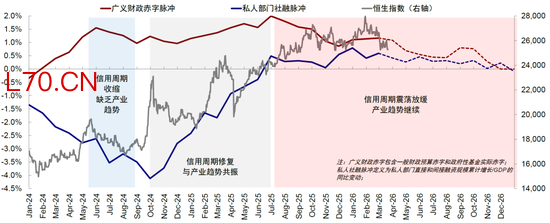 这种情形下,权益资产的下行压力也会得到缓解。不过上行空间的打开,不考虑疤痕效应的话,还是需要来自基本面的支撑。换言之,除部分跌幅较大的市场如恒科外,由于也没有计入很悲观的预期,性价比和弹性也有限。即便没有伊朗局势的扰动,我们原本也判断2026年中国信用周期可能转为整体震荡持平,进而约束指数整体的空间,这也是在年初市场亢奋触及我们的点位时,我们并没有进一步上调点位的原因。此外,二季度信用周期的弱季节性也可能会带来阶段性压力,因此部分投资者选择略降仓位观望或局势明朗后加仓,也不失为一种合理选择。