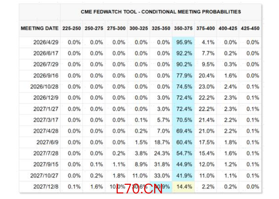 图表:CME利率期货已经将降息预期推迟至2027年12月