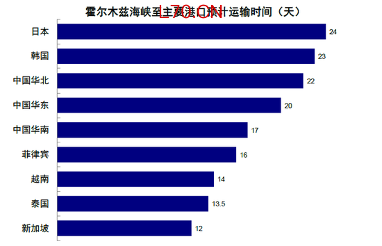 图表:按VLCC约12-14节的常见航速估算,预计霍尔木兹海峡至东亚主要港口在10-20余天