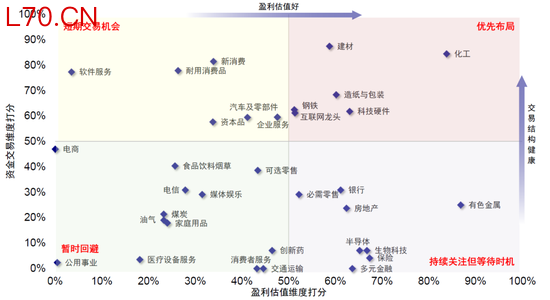 从纯粹基于量化数据的短期轮动角度,我们定量的行业轮动打分模型显示,短期科技硬件、互联网、化工、建材、钢铁盈利估值和资金交易维度表现较好,可作为优先布局的选择;银行、生物科技、有色等板块基本面强、资金交易打分偏低,可以持续关注等待时机,更适合作为中期底仓或左侧配置;相反,煤炭、油气和公用事业等短期有些拥挤。需要说明的是,该模型单纯基于短期数据反映板块状态,更适用于长期基本面逻辑外的辅助参考,如景气方向在短期过于拥挤状态下也不宜过度追高。