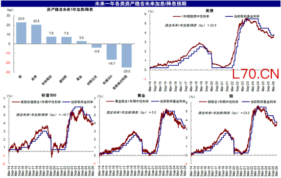 以此为参照,进一步再将不同资产计入的预期拆解出来,就可以发现不同资产的定价差异。具体而言,当前资产计入的未来1年降息幅度为:美联储点阵图(-1次)> 标普500(-0.7次)> 纳斯达克(-0.2次)> 黄金(+0.1次)> 道琼斯(+0.3次)≈ 利率期货(+0.3次)> 美债(+0.8次)> 铜(+0.9次)。