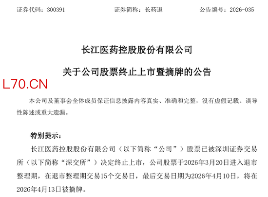 4月12日晚,长药退发布公告称,公司股票已被深交所决定终止上市,于3月20日进入退市整理期,最后交易日期为4月10日,将在4月13日被摘牌。