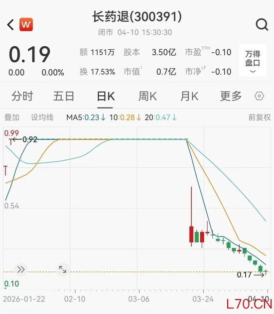 Wind数据显示,截至4月10日,长药退股价为0.19元/股,今年以来累计跌幅达78.16%。