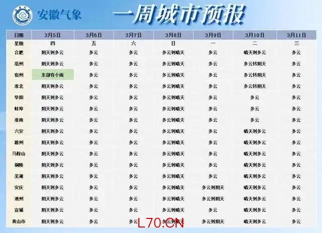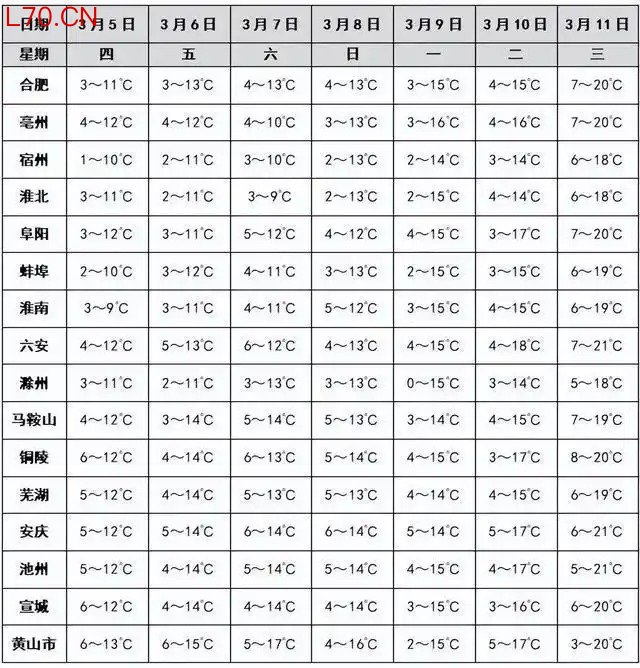 据安徽气象预报,11日前全省以多云天气为主,12日前后我省有一次降水过程。气温方面,9日前全省大部分地区最高气温普遍低于16℃;10-12日我省气温回升,其中11-12日淮河以北最高气温18~20℃,淮河以南19~22℃。不过,12日后有一股冷空气影响我省。