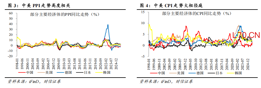 从中美对比来看,PPI走势高度相关,CPI走势大相径庭。PPI构成中原材料、能源及中间品的权重极高,这些大宗商品的定价权高度国际化,价格直接受全球供需、地缘政治等因素的共同影响。因此,当全球出现“资源民族主义”抬升矿产出口成本、或供应链中断引发初级产品涨价时,输入型通胀压力会通过进口渠道几乎无衰减地直接冲击PPI。相比之下,CPI以终端消费品和服务为主,虽然其构成中食品、能源等分项也受国际价格影响,但多数分项受到国内储备调控、价格管制等内部因素缓冲,中间企业也可能成为价格传导的缓冲垫,因此国内PPI-CPI的传导程度有限。不同于中国的是,大部分发达经济体由于GDP中消费占比较高、经济的运行对进口依赖较大,并且PPI-CPI的传导较为顺畅,通胀走势大体相近。例如中美PPI高度相关,CPI走势分化,反映国际大宗对PPI的直接冲击更强。