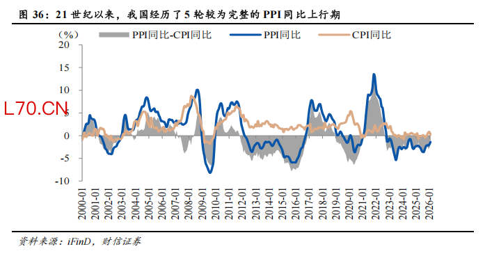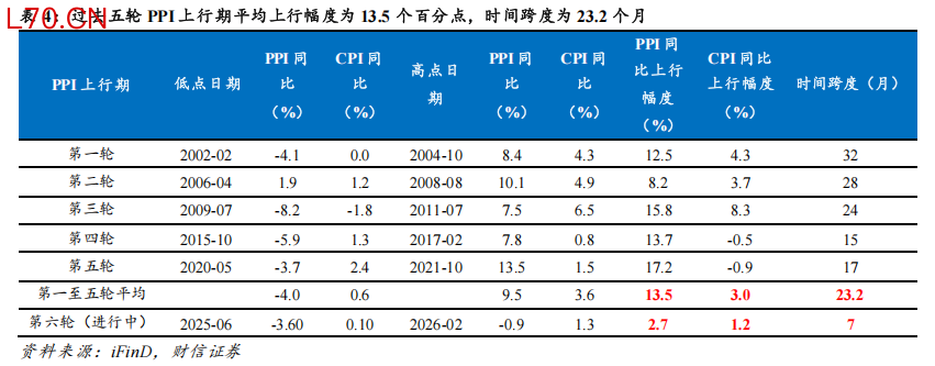 21世纪以来,我国经历了5轮较为完整的PPI同比上行期,本轮PPI上行期属于第六轮。具体来看,2002.2-2004.10、2006.4-2008.8、2009.7-2011.7、2015.10-2017.2、2020.5-2021.10,除了第二轮PPI同比低点为正值,其余皆为PPI同比由负转正。本轮PPI低点出现在2025年6月,当月PPI同比录得-3.6%,目前尚未转正。