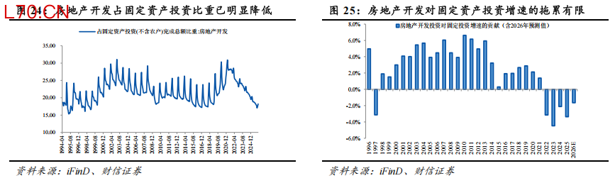 同时,房地产开发占固定投资比重在过去5年已明显降低,未来对经济的拖累有望逐渐缓减。国家统计局的数据显示,2025年房地产开发投资同比下降17.2%,房地产开发投资占固定资产投资比重已从高点的30%以上掉落至18%左右,未来大幅下滑的空间有限。中性情景下,2026年房地产开发投资总额同比将下降10%,降幅较2025年有望收窄7个百分点,对固定资产投资的拖累从2025年的3.4个百分点收窄至1.6个百分点,对工业品需求的拖累也将逐步缓减。