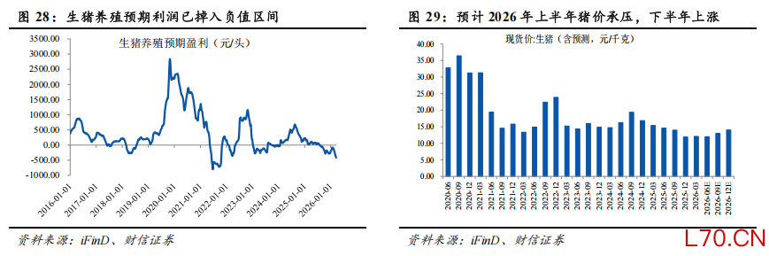 从能繁母猪存栏量去化趋势来看,我们预计2026年上半年猪价仍将承压,下半年有望逐步上涨。2025年以来,供应过剩压力导致猪价持续下跌,截至3月18日生猪养殖预期盈利已经下降到-415元/头,属于历史极低水平。但2025年底的能繁母猪存栏量仍为3961万头,距离农业农村部3900万头的调控目标仍有距离,因此,我们预计2026年上半年猪价或仍将在低位徘徊,需等待生猪养殖利润进一步恶化带动产能去化后,生猪价格有望于下半年迎来涨价周期,整体呈现前低后高、逐步上涨的态势。中性情景下,我们预计2026年猪肉均价同比跌幅较2025年收窄约8.5百分点,对CPI猪肉分项同比的拖累收窄约5.4个百分点,进而对CPI同比的拖累有望收窄约0.1个百分点。