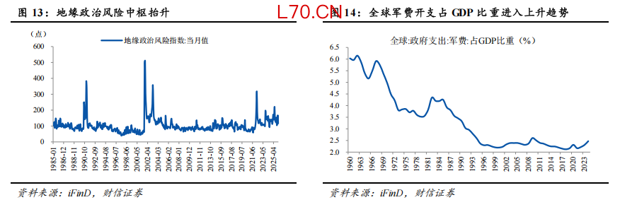 我们认为,军费开支上升与地缘政治风险上升将呈现“双螺旋上升”的态势,势必将加剧未来大宗商品的波动,强化囤货逻辑。历史经验显示,在供应链断裂情境下,投入军费的边际安全收益,较和平时期提升数倍,指向商品价格的波动率将进一步上行,强化各国对安全冗余的重视程度、加大战略储备力度。效率让位安全的大背景下,军费扩张已从“可选政策”变为“生存刚需”,我们预计全球军费占GDP比重将维持在上升通道中,有望持续推升军事支出相关的资源品价格。