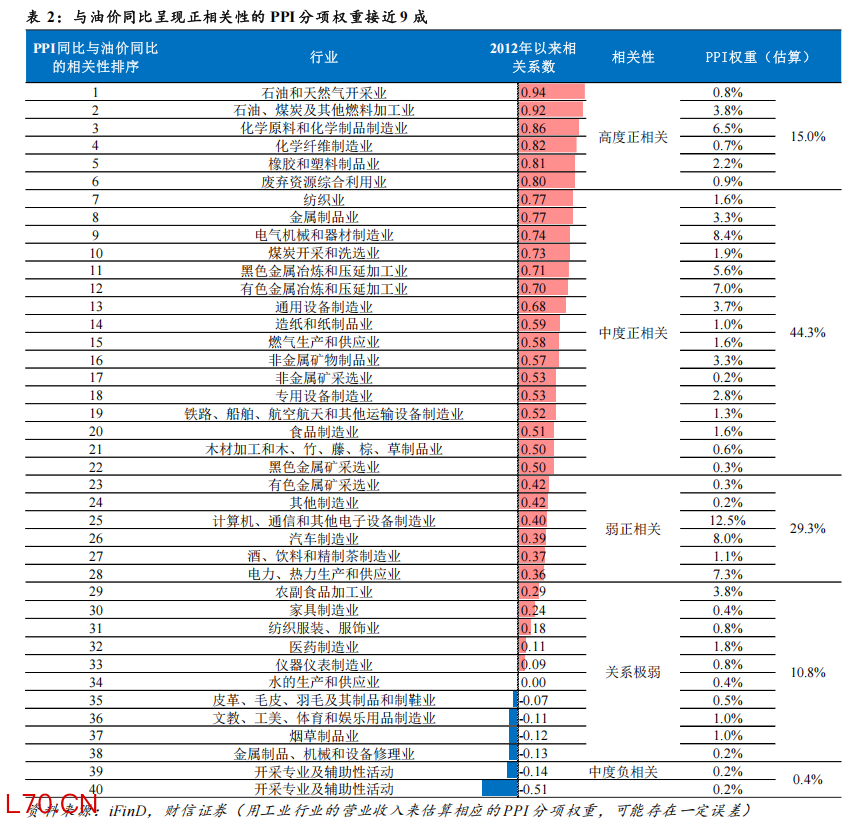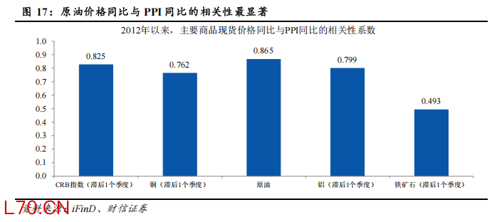进一步拆分,从主要大宗商品中优中选优,原油是衡量输入型通胀的最佳商品。我们梳理了2012年以来原油、铜、铝、铁矿石四类最具有代表性的资源品的价格同比增速,与PPI同比进行相关性分析,发现原油价格同比与PPI同比的相关性最高,达到0.865。原因在于,一方面原油价格可以直接传导至成品油,传导非常直接,另一方面通过替代效应传导至其他能源价格,并且通过石油化工链条传导至各行各业,辐射面极广,是表达输入型通胀的最佳代理变量。而以铜为代表的金属类,下游一方面相对更加分散,另一方面传导的链条更长且更复杂,反倒是将价格同比增速滞后一个季度后,与PPI同比增速表现出较好的正相关性,铝、铜、铁矿石(滞后一个季度)价格同比与PPI同比的相关系数分别为0.799、0.762、0.493。