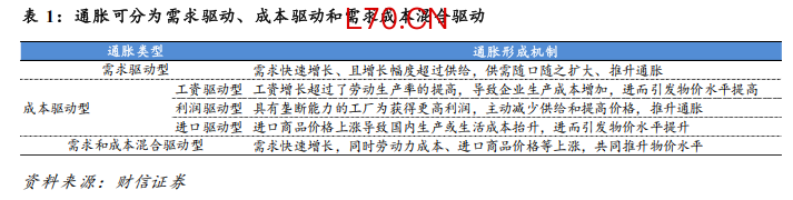 从驱动因素来看,通胀可分为需求驱动、成本驱动和需求成本混合驱动。需求驱动型通胀,主要由需求驱动,背后的形成机制是需求增长幅度超过供给,供需缺口随之走扩、推升通胀。与需求驱动型通胀相比,成本驱动型通胀的出现,主要与供给端成本出现大幅抬升有关,可能原因包括劳动力工资大幅增长、企业主动减产提价、供给受到冲击,以及进口商品价格抬升等。而当需求向好与供给端成本大幅上涨同时发生时,表现为需求成本混合驱动型通胀,以1970年代全球大通胀最为典型。