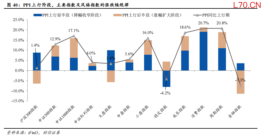 从主要指数及风格指数来看,PPI同比转正前沪深300跑赢,但伴随PPI同比转正后中证1000表现出更好的上涨持续性。为了更直观地对比,我们挑选出PPI同比低点为负的三轮上行周期,其中将PPI同比由负转正的阶段定义为PPI同比上行前半段,将PPI同比涨幅扩大阶段定义为PPI同比上行后半段,我们发现前半段平均历经7.7个月,平均上行幅度为6.1个百分点;后半段平均历经16.7个月,平均上行幅度为9个百分点。从主要指数来看,沪深300指数表现为先扬后抑,前、后半段涨跌幅分别为8.7%、-6.3%;中证500指数表现相对稳定,前、后半段涨跌幅分别为7%、5.3%;中证1000表现为先抑后扬,前半段、后半段平均涨跌幅分别为6.4%、9.5%。从主要风格来看,PPI上行前半段,消费风格平均涨幅达到19.2%,跑赢其他风格;PPI上行后半段,周期、成长风格后来居上,平均涨幅分别为7.8%、7%。因此我们总结出,PPI上行前半段,大盘风格、消费风格最为受益;但伴随着PPI逐步转正,小盘风格、周期风格、成长风格表现出更好的上涨持续性;此外,红利指数尽管涨幅不大,但在PPI上行前半段、后半段都录得正收益;稳定风格在PPI上行前半段表现一般,但在PPI同比上行后半段录得正收益。