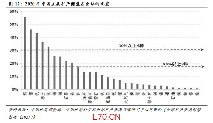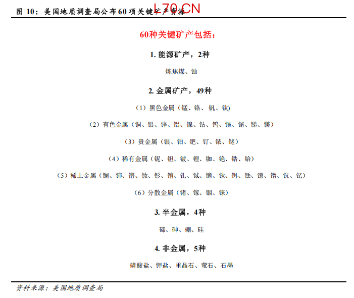 中国方面,为保障经济安全和国防安全,满足战略性新兴产业发展需要,于2016年将24种矿产列入战略性矿产目录。中国战略性关键矿产资源丰富,是战略性关键矿产开采、生产、消费和出口大国,在全球格局供需两侧都占据重要地位。其中,稀土、钨、锑、锂、镓、石墨等多个矿种在全球供应链上已形成一定掌控力,但在铂族金属、铌、钽等战略性金属国内基本没有资源赋存。随着战略性关键矿产领域国际竞争加剧,2016年国务院批复《全国矿产资源规划(2016一2020年)》。从矿产的类型看,包括煤炭、石油、天然气等能源矿产,铁、铝、铜等基础金属,金、稀土等贵金属、稀有金属,以及磷、萤石、石墨等非金属矿产。