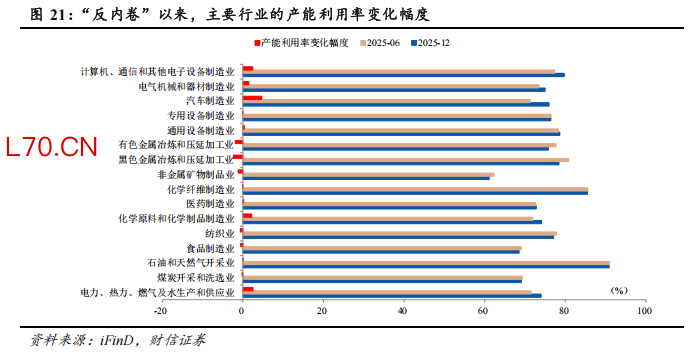 相比更偏行业自律性质的2025年反内卷,2026年反内卷更注重管理与立法,从“综合整治”升级为“深入整治”。2025年的政府工作报告提出的是,破除地方保护和市场分割,打通市场准入退出、要素配置等方面制约经济循环的卡点堵点。2025年的反内卷,取得了部分成效,例如2025年12月汽车制造业、电力、热力、燃气及水生产和供应业、计算机、通信和其他电子设备制造业、化学原料和化学制品制造业、电气机械和器材制造业产能利用率分别较2025年6月提升了4.7、2.5、2.4、2.2、1.5个百分点。从治理手段看,2026年政府工作报告要求“综合运用产能调控、标准引领、价格执法、质量监管等手段”,举措更注重管理与立法,核心手段包括通过调整出口退税政策、规范行业标准、强化产品质量与安全监管等方式,引导产能有序出清与升级。例如2026年4月1日起,我国光伏组件出口退税率从9%降至0,储能锂电池出口退税率将从9%下调至6%。