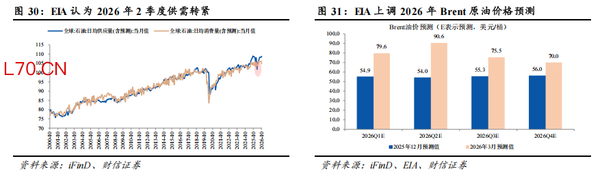 伊朗局势长期化引发原油价格中枢系统性抬升。EIA(美国能源信息署)的数据显示,2022年以来全球原油整体上供大于求,Brent原油价格持续回落。EIA在2026年3月预测,2026第一季度、第二季度、第三季度、第四季度的油价均价分别为79.6、90.6、75.5、70美元/桶,平均较2025年12月的预测价上调23.8美元/桶。在此基础上,我们预计2026年原油均价同比增速较2025年高出约27.4个百分点,对CPI能源分项同比的拉动率较2025年高出约9.3个百分点,进而对CPI同比的拉动率有望较2025年高出0.6个百分点。