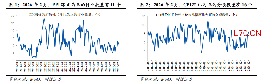 目前来看,本轮通胀属于需求成本混合驱动型通胀。本轮物价回升,具有需求驱动的因素,例如算力增长带动部分行业需求增加并推动价格上行,2026年2月计算机通信和其他电子设备制造业价格环比上涨0.6%,春节假期消费需求集中释放影响带来服务项涨价,2026年2月服务价格上涨1.6%,但是在我国总需求不足的宏观背景下,主要表现为结构性需求驱动;本轮通胀也带有明显的成本驱动特征,例如国际有色金属、原油价格上行拉动国内相关行业价格上涨,2026年2月有色金属矿采选业、有色金属冶炼和压延加工业价格环比分别上涨7.1%和4.6%。