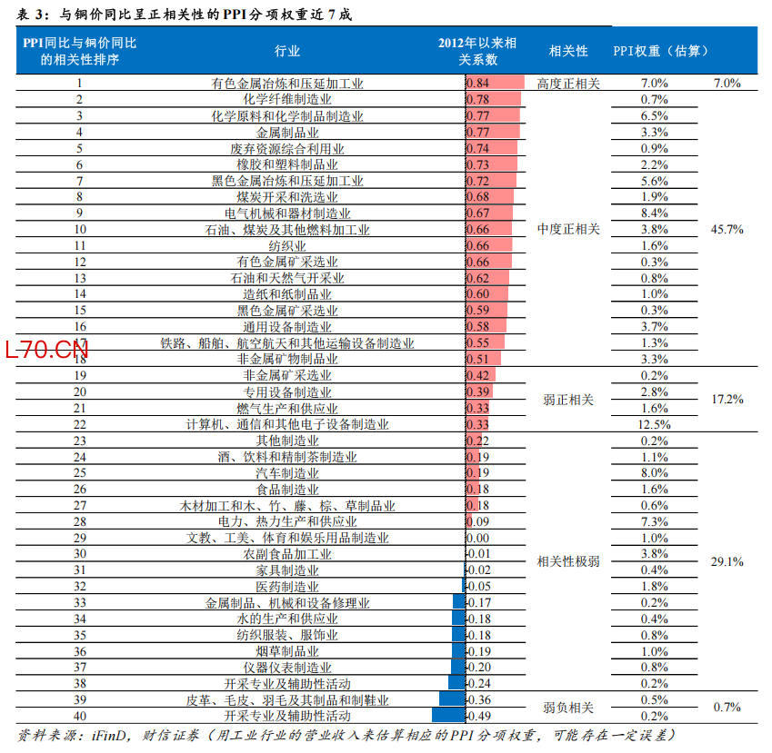 相比原油,与铜价同比呈正相关性的PPI分项权重低一些,但依然接近七成。2012年以来,与铜价同比增速呈现高度正相关性、中度正相关性、弱正相关性的PPI权重分别为7%、45.7%、17.2%,合计接近七成。从数据来看,部分行业的相关性较高,其中“有色金属冶炼和压延加工业”的相关性最高,2012年以来的相关系数达到0.84,表明该行业PPI同比与铜价同比的关联极为紧密。回归系数显示,2012年以来铜价每上涨1个百分点,带动PPI同比上涨0.19个百分点。保守起见,我们假设2026年铜现货平均价格为10万元/吨,计算出同比增速为23.3%,较2025年同比增速高出约15.2个百分点,对PPI同比的拉动率较2025年高出约2.9个百分点。