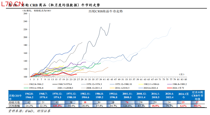 从中长期视角来看,市场的分歧在于这轮商品牛市是走向尾声还是上涨中继,我们倾向是上涨中继,且输入型通胀的压力被低估。从更长视角来看,我们发现本轮商品涨价的持续性符合牛市门槛,但涨幅远不及历史过往数轮牛市,或指向未来输入型通胀的强度可能会超预期。我们取CRB商品指数的月度均值,系统梳理了1960年代以来的11轮商品牛市行情,发现持续月数为18-76个月(均值为37个月),累计涨幅为18%-135.3%(平均为59.2%),而本轮CRB商品指数上涨起于2024年1月,目前持续了25个完整月,已经超过了1982.11-1984.6、1968.7-1970.4、2020.4-2022.4三轮牛市,但累计涨幅为6.6%,远低于过往历轮牛市的同期水平。再结合看涨资源品的四条核心逻辑,我们认为本轮商品牛市远未结束,未来将持续成为输入型通胀的核心来源。