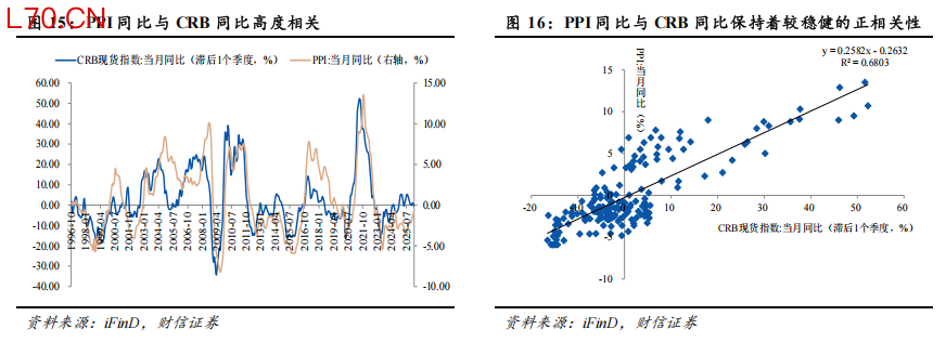 结合前面分析的四条核心逻辑——1)伊朗局势长期化:新一轮能源危机的持续性及扩散效应。2)资源国的觉醒:新一轮“资源民族主义”的持续发酵;3)需求端的逻辑强化:国家战略储备与AI资本开支浪潮的共振;4)效率让位安全:地缘风险抬升,军费开支占比重回上升通道,我们认为原油、有色金属为代表的资源品涨价尚未结束。我们以CRB商品指数作为衡量输入型通胀的代理变量,发现CRB指数同比一般领先PPI同比1个季度左右,整体来看,将CRB指数同比滞后1个季度与PPI同比保持着稳健的正相关关系,换言之,CRB指数同比对一个季度之后的PPI同比有较高的预测意义。