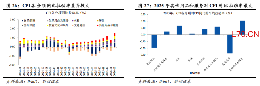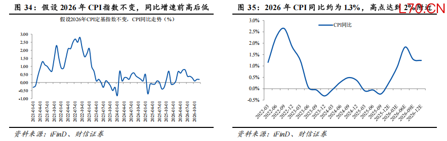 ②在政策支持下,家具、家电、旅行服务等为代表的其他核心CPI相关分项有望延续涨价趋势。中央经济工作会议提出,“深入实施提振消费专项行动,制定实施城乡居民增收计划。扩大优质商品和服务供给”,“把促进经济稳定增长、物价合理回升作为货币政策的重要考量”,我们预计政策支持下,未来生活用品及服务、衣着、医疗保健、教育文化和娱乐等有望维持涨价趋势,带动2026核心CPI同比增速继续上行至1.6%左右,意味着对CPI同比拉动率较2025年高出0.6个百分点。