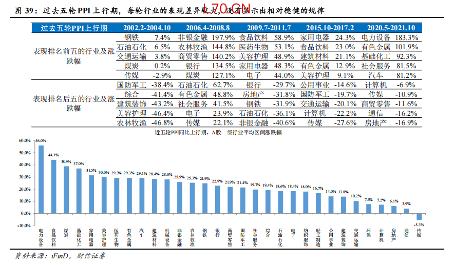 从行业角度来看,过去五轮PPI上行期,每轮行业的表现差异较大。从过去五轮PPI上行期的均值水平来看,电力设备、食品饮料、煤炭行业表现较好,位列前三,房地产、通信、传媒行业表现较差,位列后三。对于表现较好的行业而言,资金优先追逐盈利改善最直接的上游煤炭行业、兼具抗通胀能力与“防御+复苏”属性的食品饮料行业,以及能源转型长期趋势叠加顺周期属性的电力设备行业,但食品饮料行业需重点关注生产资料-生活资料PPI-CPI的传导是否顺畅。对于表现较差的行业而言,房地产行业受制于自身下行周期与政策约束,通信行业受“主题炒作降温”与“成本压力”影响,传媒行业由于需求偏后周期且受成本冲击。需要注意的是,过去通信与传媒行业的炒作多围绕主题概念展开,本轮则带着明显的产业趋势及业绩驱动导向,预计盈利增速持续超预期的部分优质标的有望持续跑赢,切忌生搬硬套历史规律。
