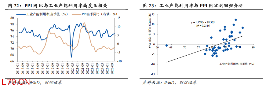 无论是反内卷还是供给侧改革,我们认为二者的共同核心变量都是工业产能利用率。目前来看,绝大部分行业的PPI同比仍处于负值区间,或说明“反内卷”政策的效果还未完全显现,具有一定滞后性。再往后看,伴随着“反内卷”政策效果逐步显现,最直接的影响是工业产能利用率的回升。经测算,2023年以来工业产能利用率每提升1个百分点,有望拉升PPI同比大约1.2个百分点。