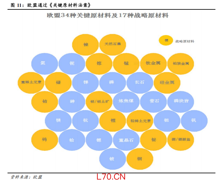 为了降低对外部关键原材料的依赖性,欧盟通过《关键原材料法案》。2024年3月18日,欧盟理事会官方网站发布公告表示已经确认通过《关键原材料法案》(Critical Raw Materials Act, CRMA),从而确保稀有金属等重要材料供应稳定,并降低外部依赖。随着欧盟从化石燃料转向更加清洁的能源系统,其对基本金属、电池材料、稀土等资源的需求将呈现指数级增长。此外,欧盟的绿色转型也要求在欧盟境内研发生产电池、太阳能电池板、永磁体和其他清洁技术。为满足这些技术研发及生产需要,欧盟对相关关键原材料的需求也大幅增长。该法案提出,欧盟2030年所需关键原材料的年供应量中10%应该来自本土开采,15%来自再生,40%来自本土加工。法案强调,稀土、锂、钴、铜、镁和钛等任何一种战略原材料对任何一个第三方国家的依赖度不能超过65%。