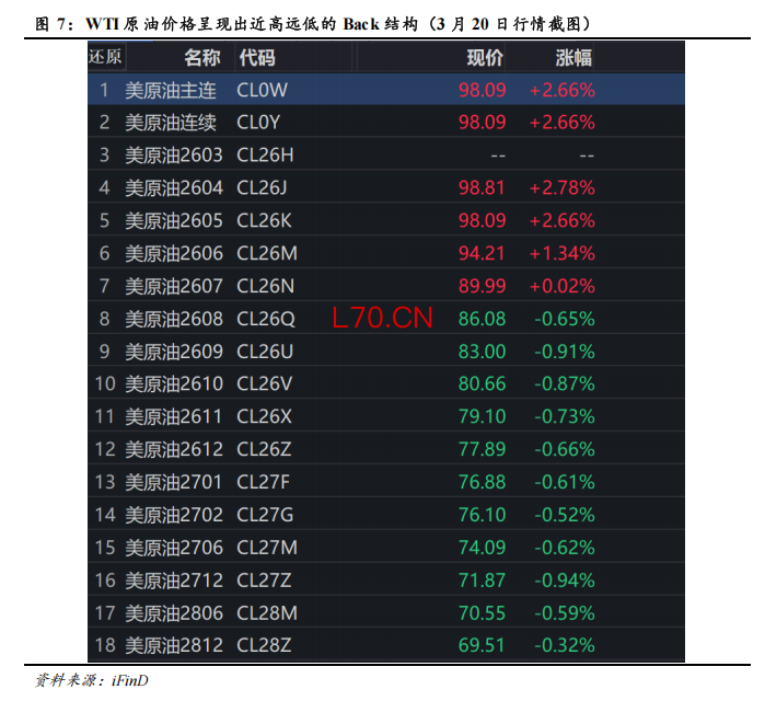 综合来看,我们认为伊朗战事引发的石油产量永久性损失被市场所低估。上述分析仅限于石油本身,从能源危机的正常扩散路径来看,石油涨价往往带动天然气、煤炭联动涨价,并且一旦中下游化工及其他制造业开始意识到上游供给短缺并开启补库,往往进一步加剧上游紧张,目前市场对此的定价或远远不足,WTI原油价格呈现出近高远低的Back结构。一般而言,原油价格呈现Back往往意味着现货紧缺,买方愿意支付溢价获取即时交割的货物;但是,如果强现实的同时遇上弱预期,例如3月20日WTI原油的2026年12月合约价格仅为77.89美元/桶,相比2026年4月合约低大约20美元/桶,意味着当下市场对于远期的供给恢复持相对乐观的态度。因此我们认为,如果未来伊朗战争进一步升级并呈现出持续时间更长的趋势、WTI原油的远期合约价格出现补涨,意味着市场开始进入正式计价伊朗战事长期化的影响。