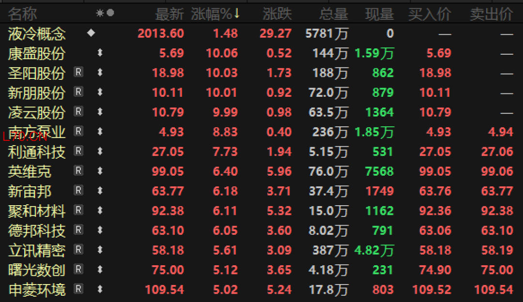 据证券时报·数据宝统计,A股市场液冷产业链概念股接近50只。截至4月10日,13只概念股今年以来涨幅超过20%,其中6股累计涨幅超过30%,包括申菱环境、光环新网、鼎通科技、鸿富瀚等。