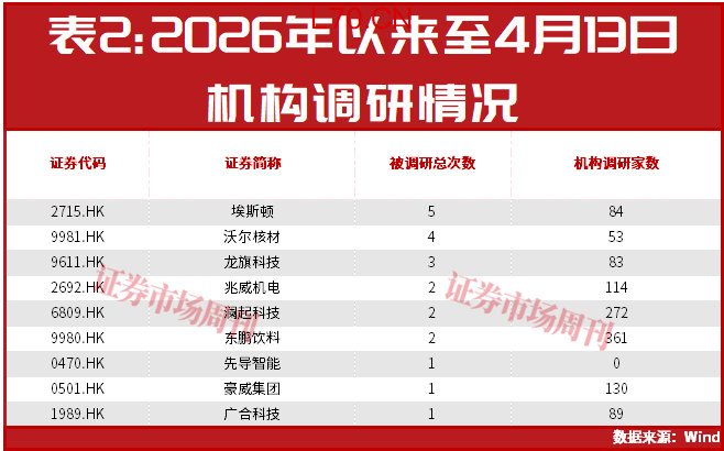 从机构关注角度而言,今年以来至4月13日,36家新上市的H股公司有12家获得机构调研。其中,埃斯顿获得5次调研,调研机构家数达84家;龙旗科技获得3次调研,调研机构家数达83家(见表2)。