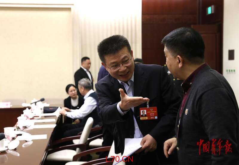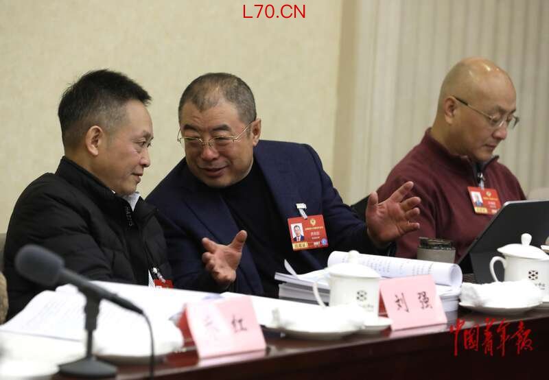 3月6日上午,北京会议中心,政协科技界别小组讨论会会议间隙,全国政协委员、奇安信董事长齐向东(中)与邻座的委员交流。中青报·中青网记者 陈剑/摄