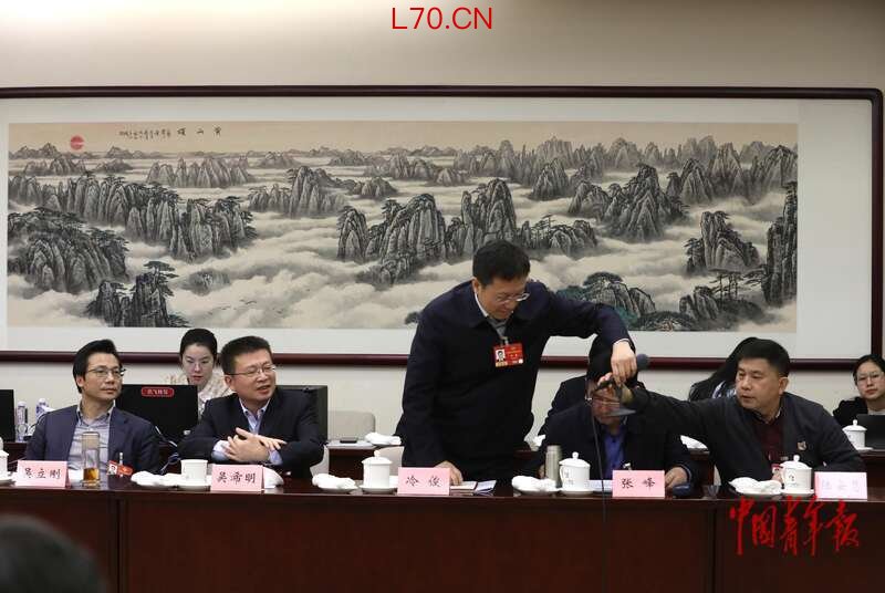 3月6日上午,北京会议中心,政协科技界别小组讨论会,冷俊委员(前排中)发言结束后,起身把话筒递给下一位发言者陆安慧委员。中青报·中青网记者 陈剑/摄